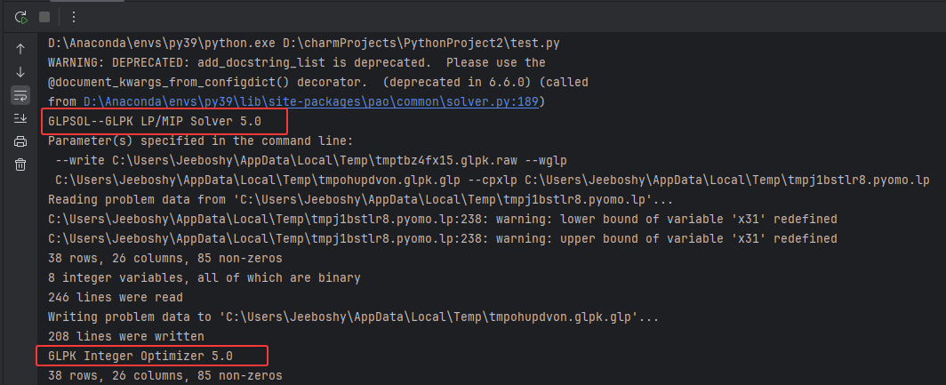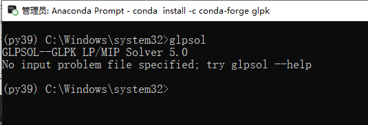 6、若同时采用两种方法安装了GLPK,此时Anaconda环境和本地电脑环境变量中均有GLPK,分别为5.0和4.65版本,会优先调用Anaconda环境的GLPK: