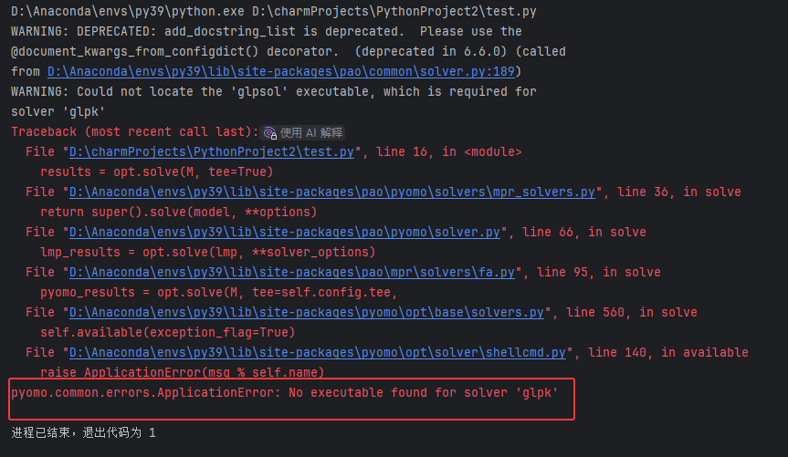 4、若未正确配置GLPK,求解过程将出现以下报错: