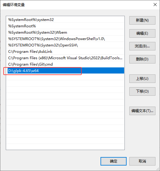 (2)下载好后解压GLPK压缩包到指定路径,将解压路径添加到环境变量path(glpk解压根路径下的w64路径)