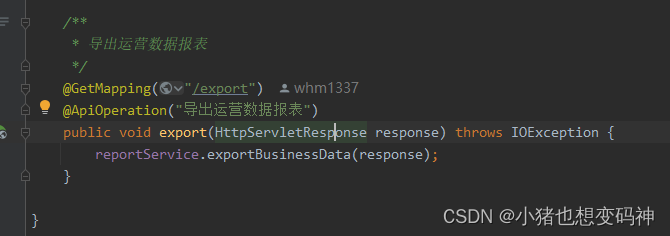 HttpServletResponse 对象在 Spring 控制器方法中作为参数传递,用于向客户端发送响应。这是通过在响应中写入生成的文件数据来实现的。使用 response.getOutputStream() 获取响应输出流,并将生成的 Excel 文件数据写入其中。