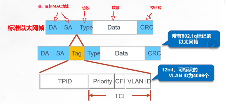 ●有标记帧(Tagged帧):加入了4字节VLAN标签的帧。