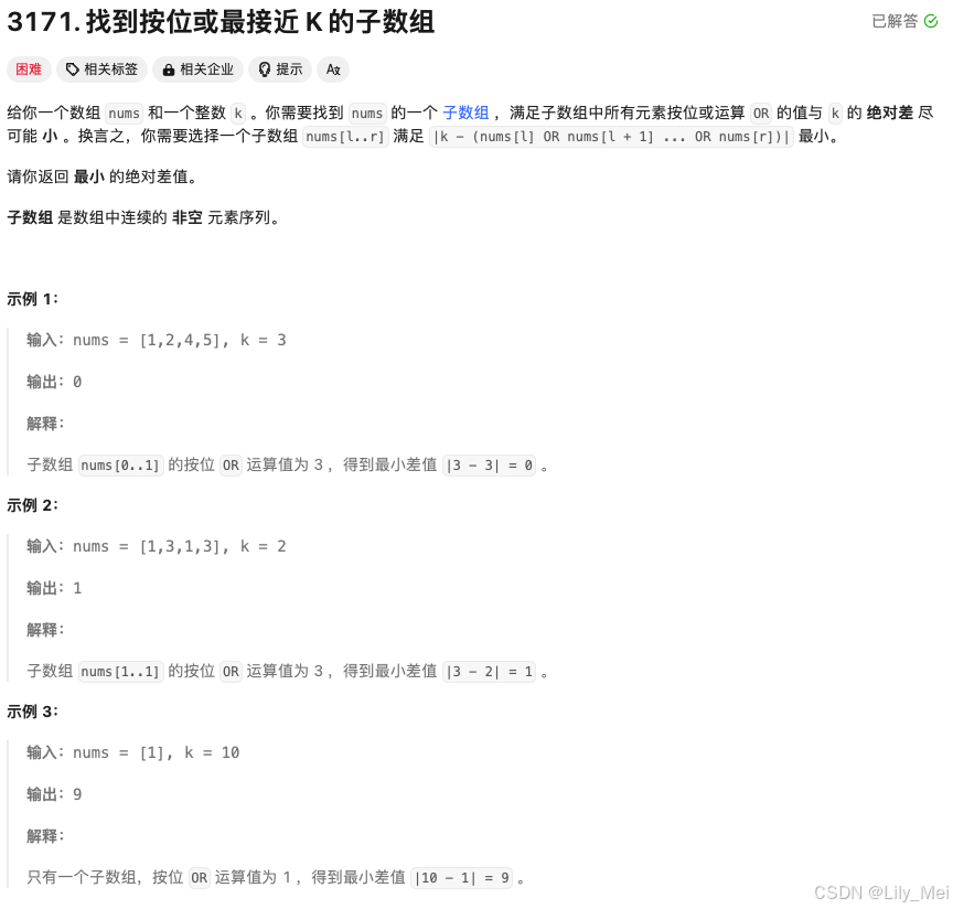 外层遍历全部的nums,内层由当前位置向前遍历,储存所有的连续元素的OR结果,并不断更新和k之间的差值。