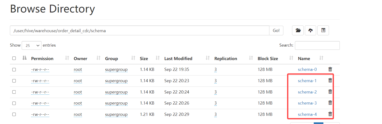- 由于这里我的流式查询已经启动,为了看到paimon的schema是否同步更新了,可以直接去hdfs上看对应的paimon表的schema文件,可以直接使用hdfs命令查看,也可以去nameNode的UI上去看。