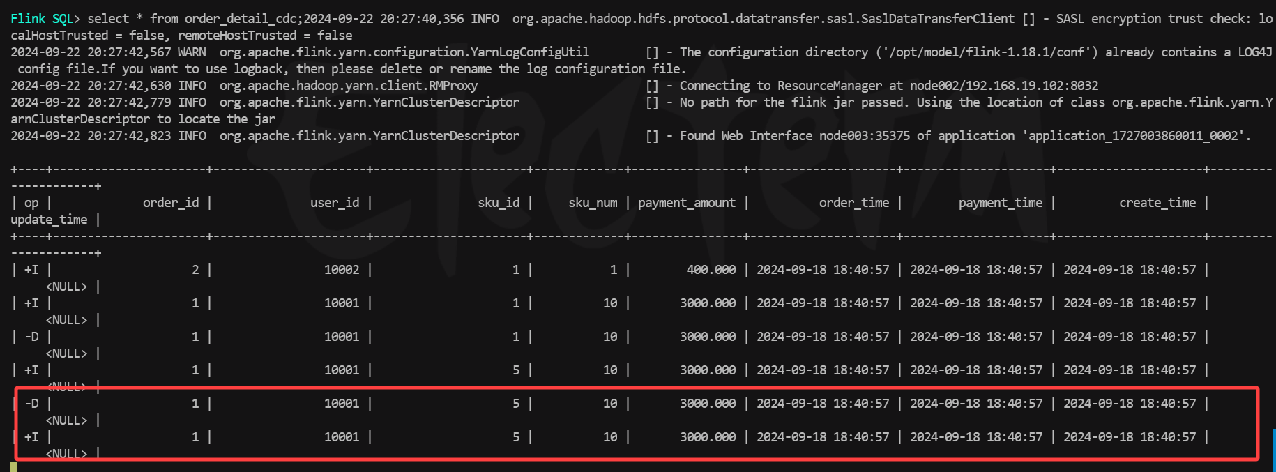 - 观察我的实时查询任务,发现flink并没有为这种元数据的变更而新增一条数据记录,为了看到这种变化,我修改mysql中的一条订单记录,触发paimon表的数据更新。但是发现paimon新增的数据记录中,并没有将user_name字段查询出来,只是更新的原来几个字段的数据变化,个人理解应该是流式任务在提交时会扫描提交时paimon表最新的schema文件进行查询,虽然后续的schema会实时的更更新,但是不会对该任务的结果产生影响。