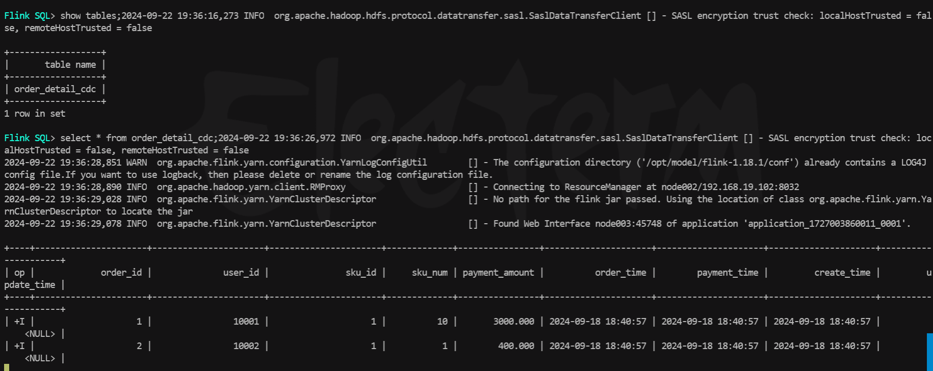 - 测试cdc同步mysql场景,首先启动同步任务,同步mysql中的订单表到paimon中