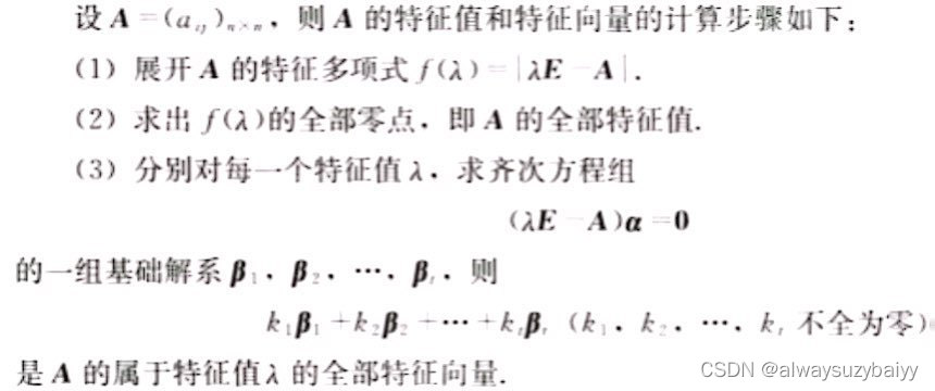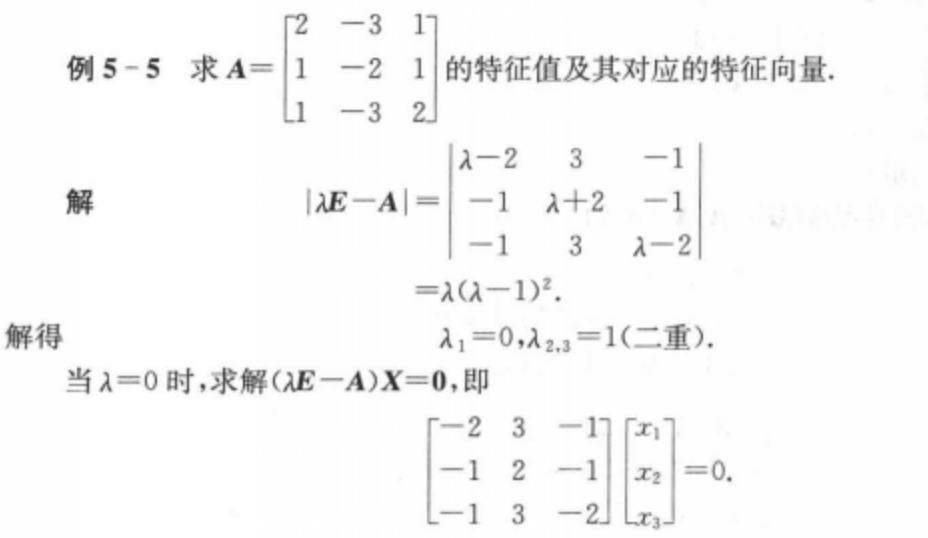 一旦己知矩阵的特征值,则通过解上图中式(3.73)给出的齐次线性方程组,可获得对应的特征向量。由于是一个奇异矩阵,其对应的简约矩阵至少有1行元素全部为 0,因此,该方程组有无穷多个解。式(3.72) 一个明显的性质是,如果