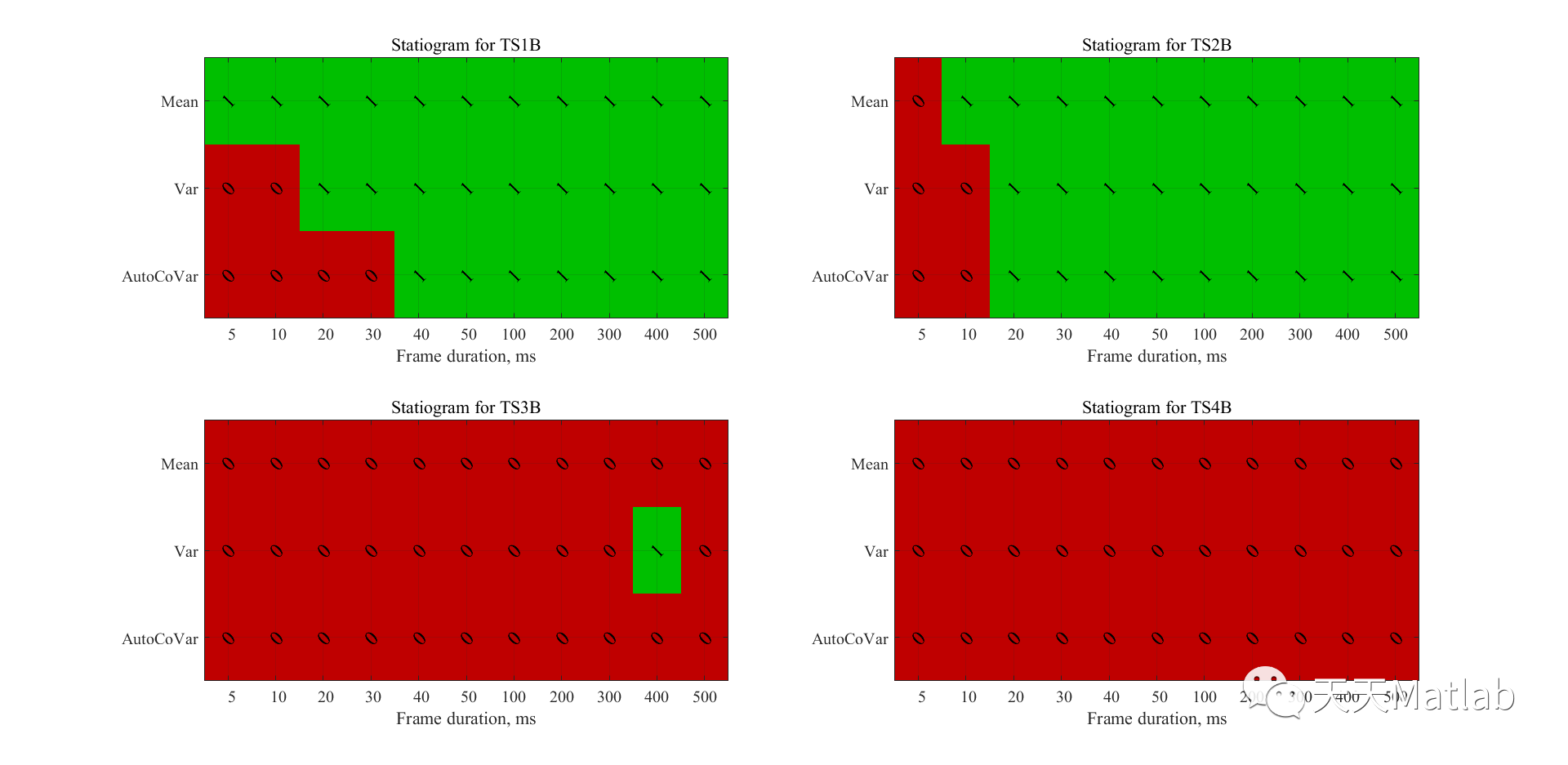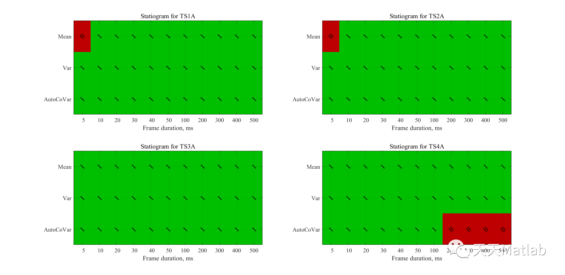 clear, clc, close all%% generate test signal% sampling frequencyfs = 44100;% TS1At1 = 0:1/fs:1;x1 = 1.0*sin(2*pi*1000*t1);% TS2Ata = 0:1/fs:0.2;tb = 0:1/fs:0.8;xa = 1.0*sin(2*pi*1000*ta);xb = 2.0*sin(2*pi*1000*tb);x2 = [xa xb];% TS3Atc = 0:1/fs:0.2;td = 0:1/fs:0.8;xc = 1.0*sin(2*pi*1000*tc);xd = 1.0*sin(2*pi*2000*td);x3 = [xc xd];% TS4At4 = 0:1/fs:1;x4 = chirp(t4, 1000, t4(end), 10000);%% statiogram computation% set the frame durations to check about stationarityfr_dur = [5 10 20 30 40 50 100 200 300 400 500]*1e-3;fr_len = round(fr_dur*fs);% set the confidence levelgamma = 0.5;% plot the signal statiogramfigure(1)subplot(2, 2, 1)statiogram(x1, fr_len, gamma)xlabel('Frame duration, ms')ylabel([])xticklabels(num2str(fr_dur'*1000))yticklabels({'Mean', 'Var', 'AutoCoVar'})title('Statiogram for TS1A')subplot(2, 2, 2)statiogram(x2, fr_len, gamma)xlabel('Frame duration, ms')ylabel([])xticklabels(num2str(fr_dur'*1000))yticklabels({'Mean', 'Var', 'AutoCoVar'})title('Statiogram for TS2A')subplot(2, 2, 3)statiogram(x3, fr_len, gamma)xlabel('Frame duration, ms')ylabel([])xticklabels(num2str(fr_dur'*1000))yticklabels({'Mean', 'Var', 'AutoCoVar'})title('Statiogram for TS3A')subplot(2, 2, 4)statiogram(x4, fr_len, gamma)xlabel('Frame duration, ms')ylabel([])xticklabels(num2str(fr_dur'*1000))yticklabels({'Mean', 'Var', 'AutoCoVar'})title('Statiogram for TS4A')