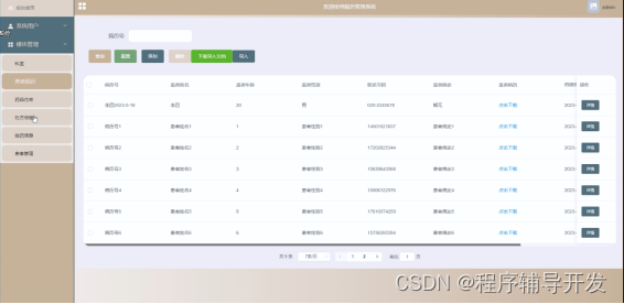 (3)患者管理:管理员点击“患者管理”会显示出所有的患者信息,支持输入患者姓名或者患者年龄对患者进行查询,如果想要添加新的患者,点击“添加”按钮,输入相关信息,点击“提交”按钮就可以添加了,同时可以选择某一条患者信息,点击“删除”进行删除,也可以点击后面的“建立病历”按钮对患者的建立病历信息进行维护;