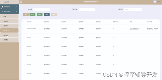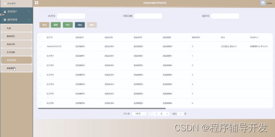 (2)处方信息:点击“处方信息”这个菜单,可以查看到系统中所有添加的处方信息,支持通过处方号或者药品编号或者药品名称对处方信息进行查询,如果想要了解某一处方的详细信息,点击后面的“详情”会进入详情界面,如果想要选择某一处方,点击“开药”按钮,根据提示填写对应的信息,点击“提交”按钮,信息没有错题在数据库就会提交成功,开药成功;