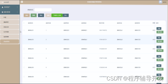 (4)患者管理:点击“患者管理”这个按钮可以查看到自己提交的所有的患者管理信息,支持通过患者姓名或者患者年龄进行查询患者信息,如果想要添加新的患者信息,点击“添加”按钮然后根据提示输入患者信息,点击“提交”后,在患者管理界面就会显示新增的患者信息,可以点击某一患者管理查看患者信息的详情;