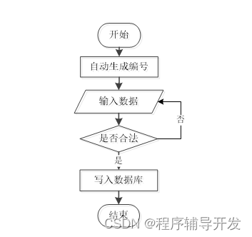 用户成功登入系统后就能够实现增加数据的操作,增加数据的编号是特定的,系统生成,用户不能随意填写,除了编号以外,其他增加信息用户自己填写,填写后的信息经过系统验证,验证合法通过就显示增加数据成功了,相反的话,就没有增加成功,图2-1显示的就是在增加数据时的流程。