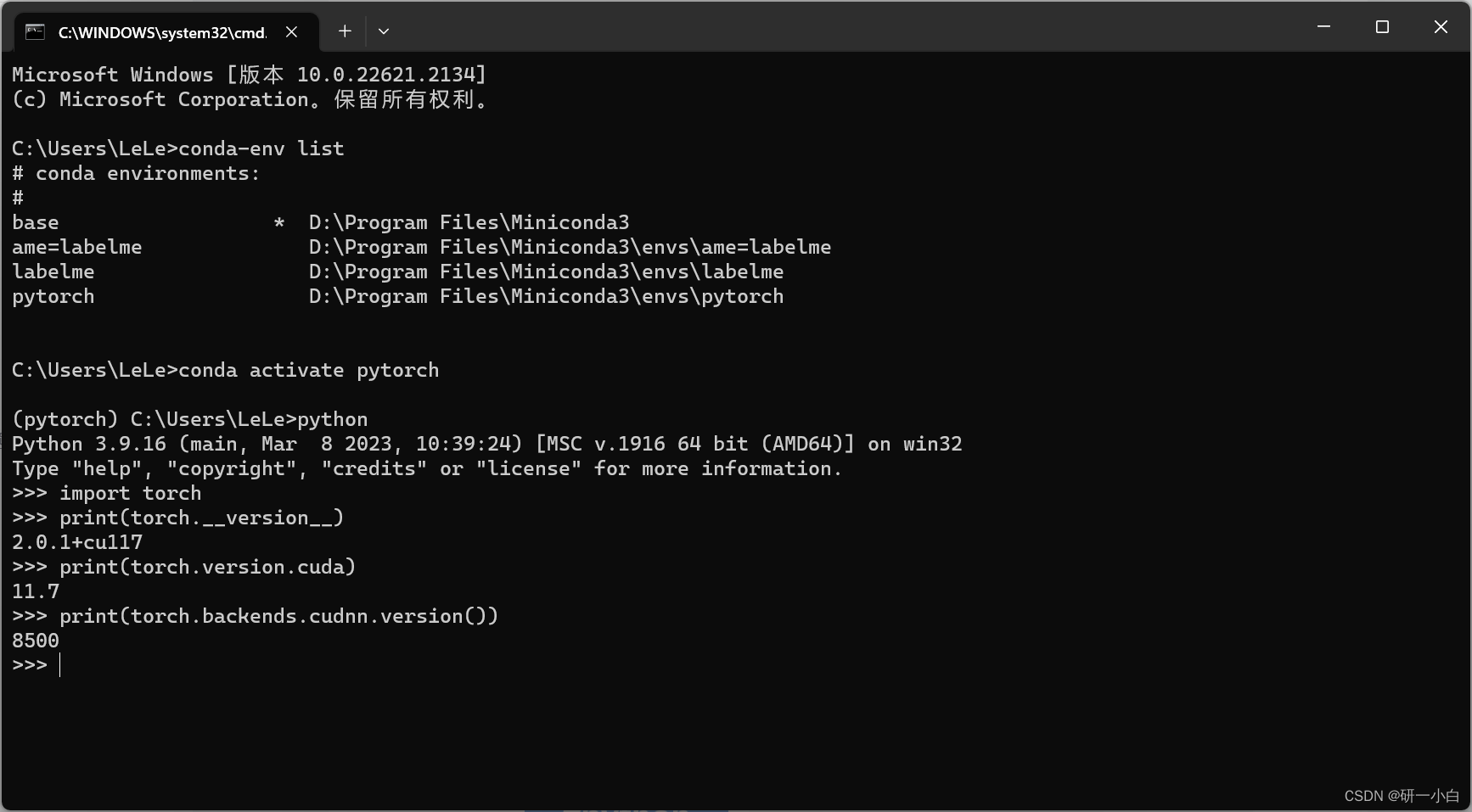 第一步:cmd打开命令窗口,输入conda-env list 查看有几个conda环境