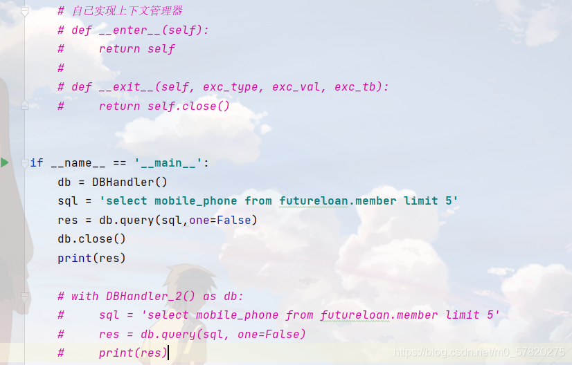 sql = 'SELECT * FROM futureloan.member LIMIT 3' # 可能会多库操作,一般在此处选择库;否则报错pymysql.err.OperationalError: (1046, 'No database selected')