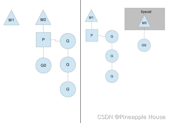 M1的来源有可能是M的缓存池,也可能是新建的。当G0系统调用结束后,根据M0是否能获取到P,将会将G0做不同的处理:
