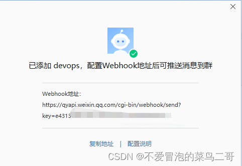 复制Webhook地址,此处webhook地址将用来用于程序集成企业微信的参数