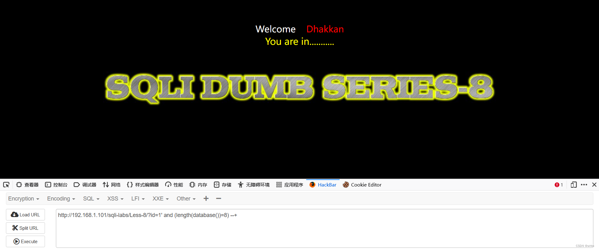 漏洞篇(SQL注入二) 1、基于布尔的盲注length 函数的使用方法:用于在 MySQL 中计算字段的长度,一个汉字是算 3 个字符,一个数字或字母算 1 个字符。由以上的返回结果可以看到可以正常执行。下面进行 sql 注入:Less-8 到 Less10 都是 GET 方式的盲注,只是闭合的方式不太一样。我们通过构造一个判断条件判断目标是否满足条件,满足条件则执行成功,不满足则执行失败。database()是当前数据库名称length(database())取出数据库名称的长度。