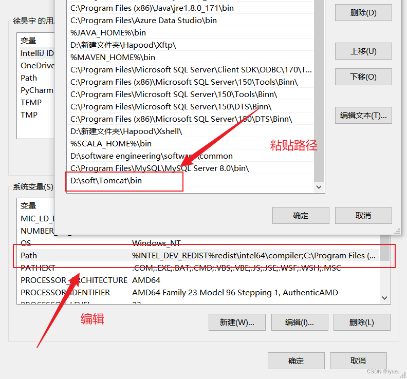到这一步我们需要配置环境变量,首先我们需要到Tomcat的bin目录下,复制该路径。右击“我的电脑”,在弹出的快捷菜单中选择“属性高级一环境变量”,在“系统环境变量”中,选择path,点击编辑,将路径粘贴到里面