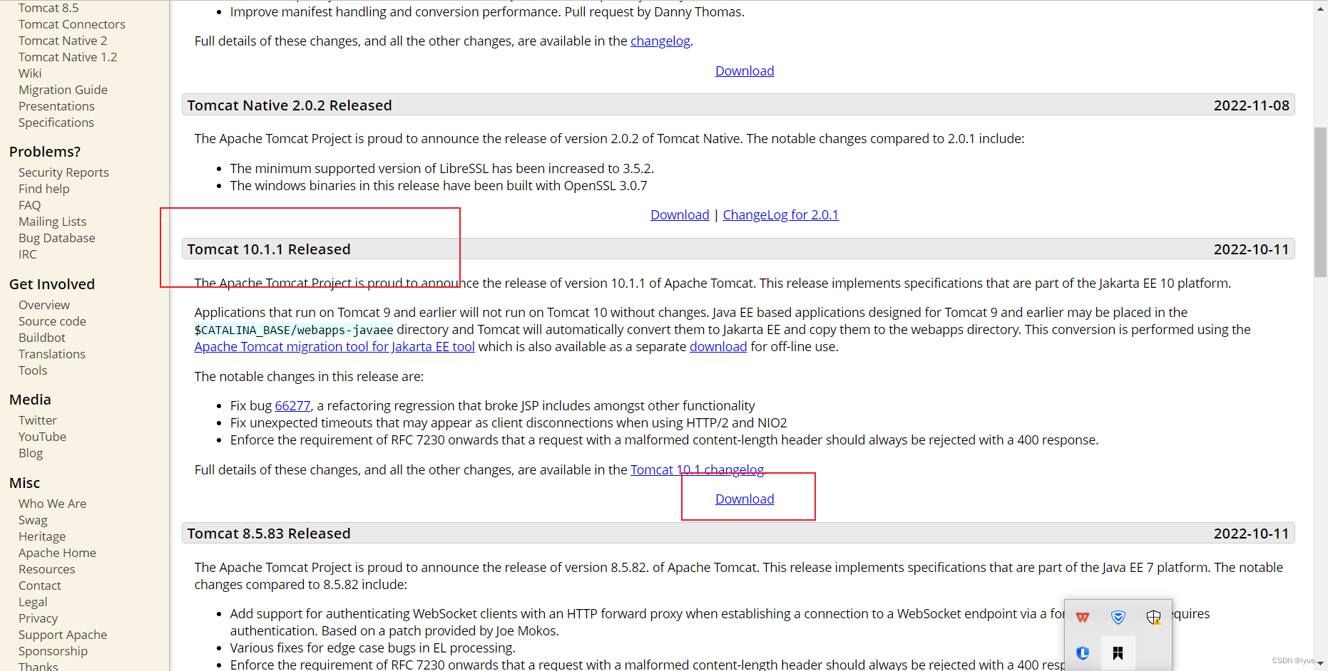进入tomcat官网,Tomcat官网,选择需要下载的版本,点击下载。在这里需要注意我们下载的Tomcat版本要与JDK版本相同,如果你的JDK版本为1.8.0,那么你就Tomcat版本必须是以8开头的版本,否则就会出错。在这里Tomcat的下载分为解压版和安装版,这里我们以解压版为例。