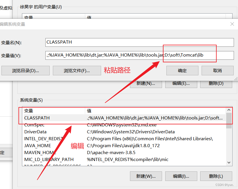 我们需要到Tomcat的lib目录下,复制该路径,在“环境变量”中,选择CLASSPATH,点击编辑,将路径粘贴到里面。