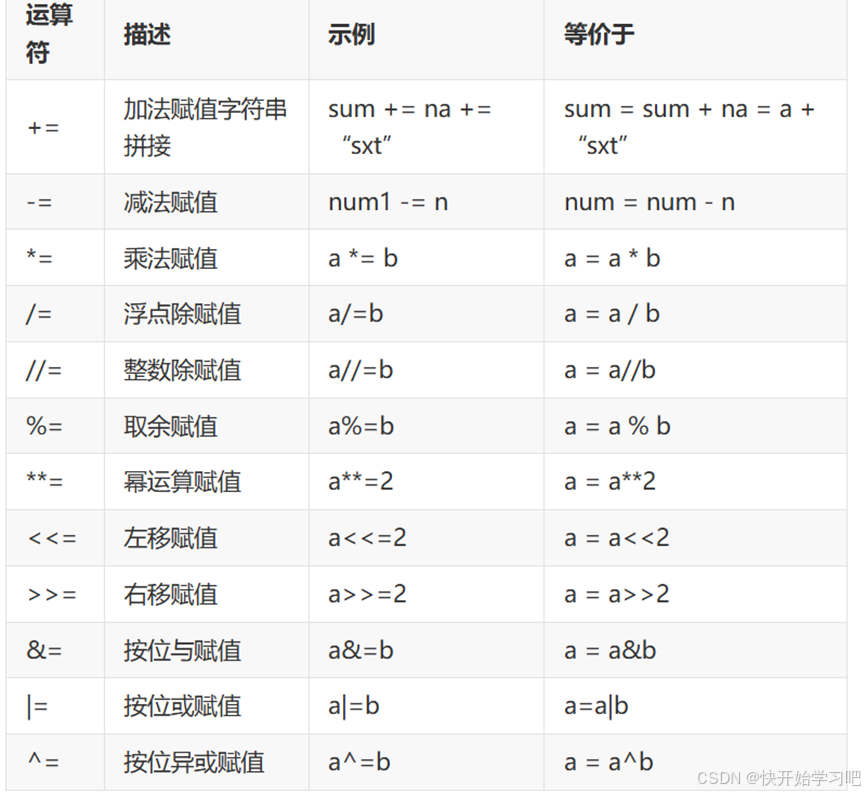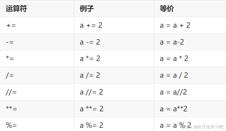 运算符+、-、*,/、//、**和%和赋值符=结合可以构成“增强型赋值运算符”。