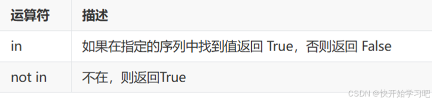 a = "python" b = "py" print(b in a) #True c = [10,20,30] print(10 not in c) #False |