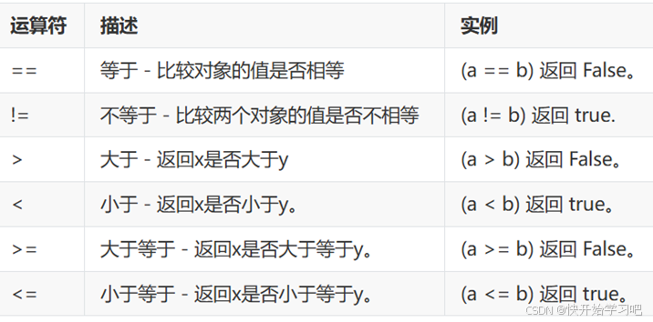 所有比较运算符返回1表示真,返回0表示假。这分别与特殊变量True和False等价。