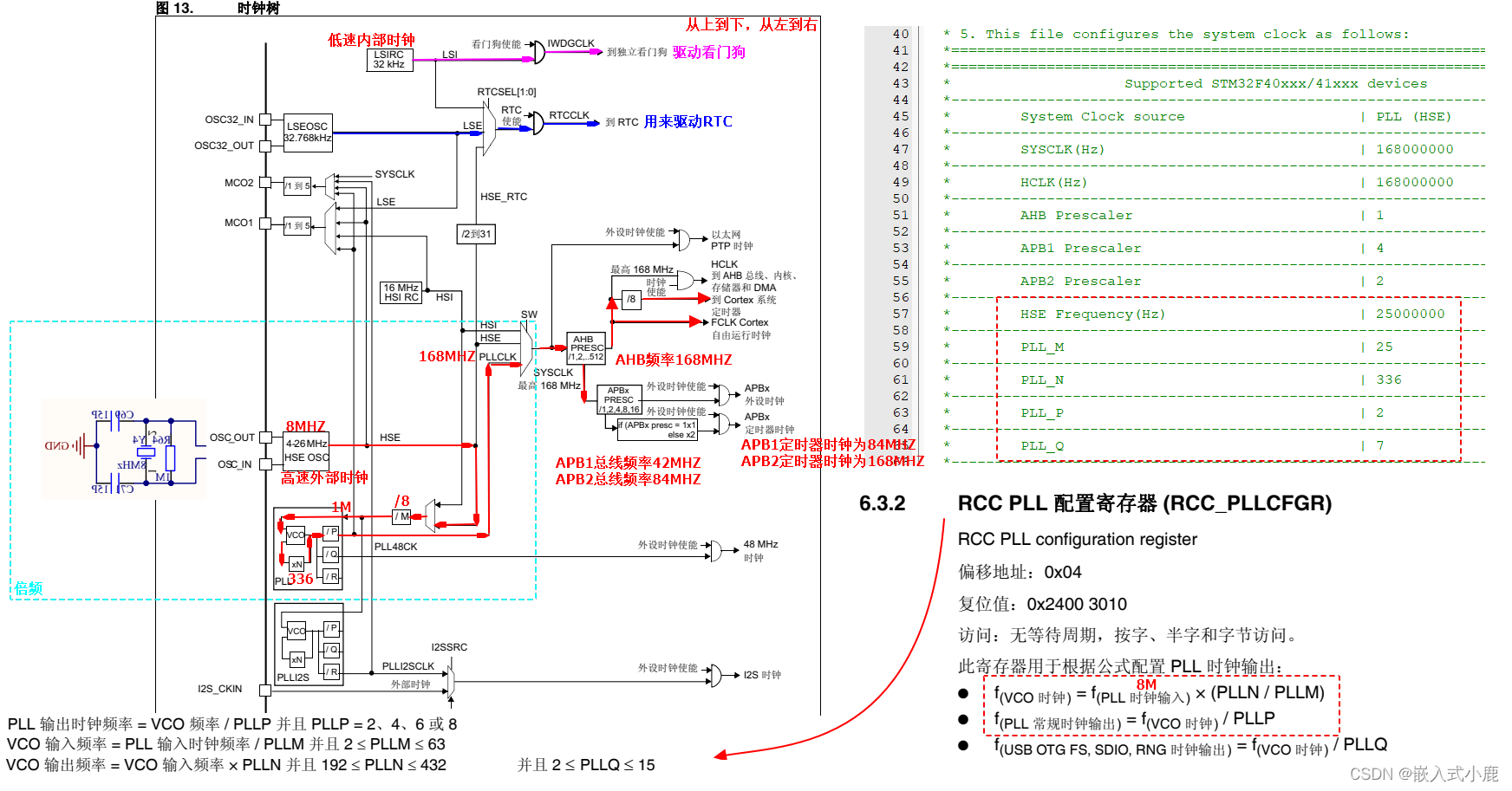 stm32时钟体系 大家可以看到标准库中使用的外部晶振是25MHZ,而开发平台实际使用是8MHZ,所以如果不去修改工程的PLL参数,会导致芯片的运行频率是错误的,所以需要修改PLL参数,可以去system_stm32f4xx.c和stm32f4xx.h两个文件中修改。时钟相当于处理器的“心脏”,外部晶振经过振荡会产生高度稳定的信号,由芯片的引脚输入芯片内部,再经过芯片内部的频率放大器进行放大或者缩小,最终变成各种总线的时钟频率,处理器的外设都是由时钟控制的,举个例子:交响乐团 指挥。思考:时钟信号是由什么产生的?
