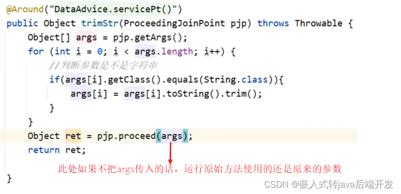 百度网盘密码数据兼容处理 需求: 对百度网盘分享链接输入密码时尾部多输入的空格做兼容处理,有时候我们会复制进去空格,这时候后台应该怎么处理我们的密码输入呢?点击链接,会提示,请输入提取码,如下图所示当我们从别人发给我们的内容中复制提取码的时候,有时候会多复制到一些空格,直接粘贴到百度的提取码输入框,但是百度那边记录的提取码是没有空格的,这个时候如果不做处理,直接对比的话,就会引发提取码不一致,导致无法访问百度盘上的内容。我们的需求是将原始方法的参数处理后在参与原始方法的调用,能做这件事的就只有环绕通知。
