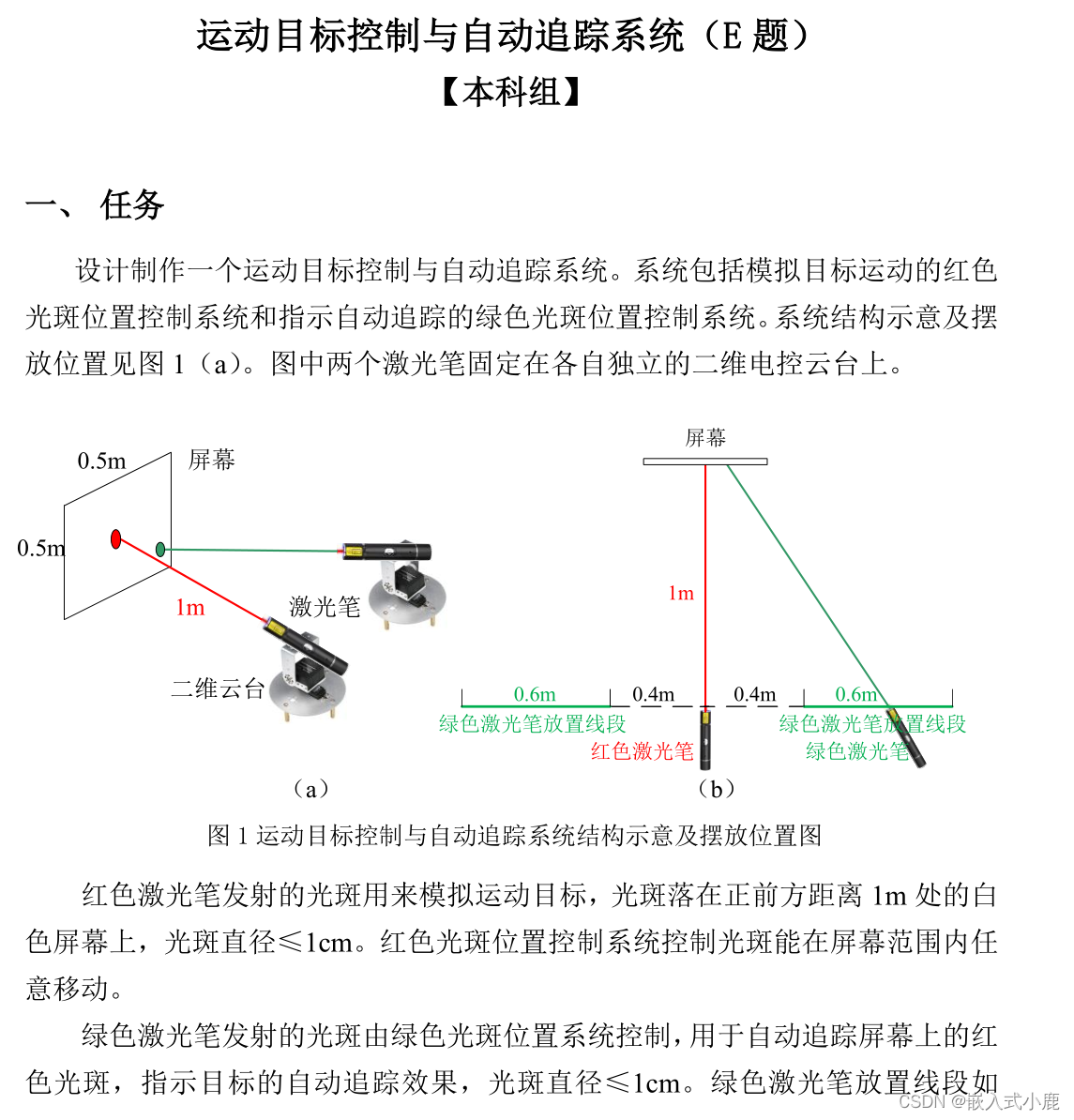 2023届电子设计大赛E题(控制类) 题目还是比较简单明白的,基础题只需要用到一个云台去做这个题目,发挥题需要用到两个云台去解决,首先前几题除了写死没有更好的办法了,我们直接来说一下发挥题怎么做吧,怎么去解决这个问题吧。做发挥题的时候我是遇到了很多问题的,开始我用的方法是区域法,就是让我识别到的绿点在我的像素中心,刚好我的红点也在我的像素中心。于是我用了这样的方法:将openmv分成5个区域,这样的的话,识别到的点在不同区域就可对应的处理了,将我们寻找到的发送给单片机去处理,不同区域不同的方法解决问题。