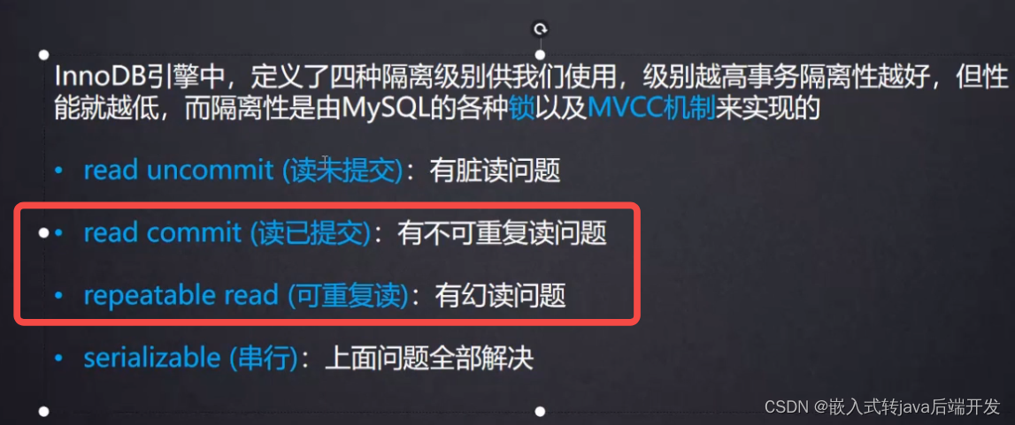 深入Mysql事务与锁机制原理 大家经常用的隔离级别是RC和RR,其中我们的mysql的隔离级别默认是RR的隔离级别的隔离级别,事务必须提交以后才能读出来,但是我们在一个方法里面可能每次读取的数据每次都是不一样的,因为另一个事务提交了数据,所以RR隔离:可以重复读数据,意思是我在自己这个事务中,我只要读过一次数据了,以后再怎么读取数据,数据的内容都是之前读取的(快照)数据一样,所以有。