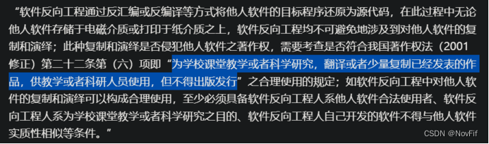 软件逆向的合法性探讨:https://zhuanlan.zhihu.com/p/453234609、https://zhuanlan.zhihu.com/p/561385390、https://bbs.kanxue.com/thread-198992.htm、https://www.gov.cn/guoqing/2021-10/29/content_5647633.htm