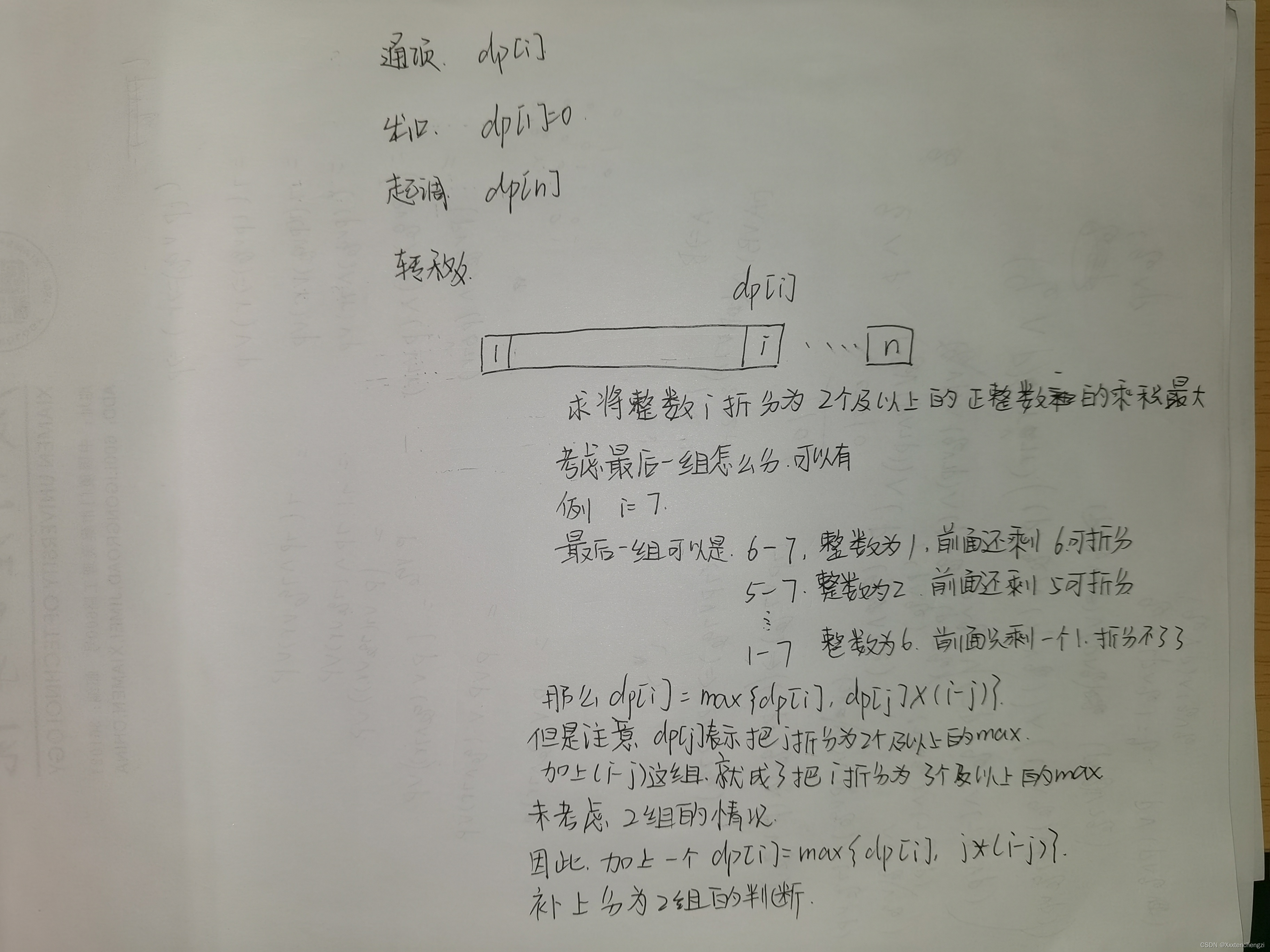 动态规划学习-整数划分 题目描述:给定一个正整数n,将其拆分为 k 个 正整数 的和(k >= 2),并使这些整数的乘积最大化。返回 你可以获得的最大乘积。示例 1:输入: n = 2输出: 1解释: 2 = 1 + 1, 1 × 1 = 1。示例2:输入: n = 10输出: 36解释: 10 = 3 + 3 + 4, 3 ×3 ×4 = 36。来源:力扣(LeetCode)链接:https://leetcode.cn/problems/integer-break...