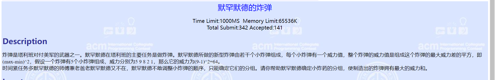 XMUTOJ-默罕默德的炸弹 Description炸弹是塔利班对付美军的武器之一。默罕默德在塔利班的主要任务是做炸弹。默罕默德所做的新型炸弹由若干个小炸弹组成,每个小炸弹有一个威力值,整个炸弹的威力值是组成这个炸弹的最大威力差的平方,即(max-min)^2,假设一个炸弹有5个小炸弹组成,威力分别为5 9 8 2 1,那么它的威力为(9-1)^2=64。时间紧任务多默罕默德的师傅兼老爸老默罕默德又不在,默罕默德不敢调整小炸弹的顺序,只能确定它们的分组。请你帮助默罕默德确定小炸药的分组,使制造出的炸弹拥有最大的威力和。Inpu