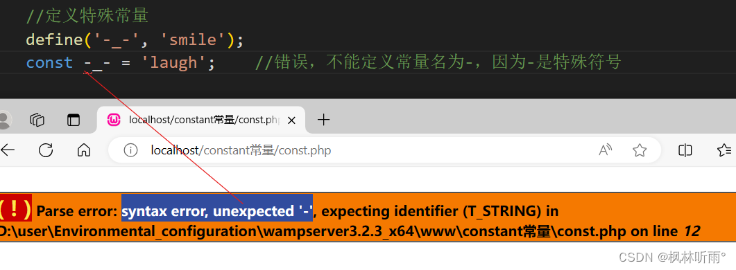 - 常量命名的规则比变量更松散,可以使用一些特殊字符,该方式只能使用define定义