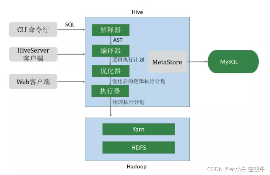 解释器 (SQLParser) :使用第三方工具(antlr)将HQL字符串转换成抽象语法树(AST);对AST进行语法分析,比如字段是否存在、SQL语义是否有误、表是否存在;