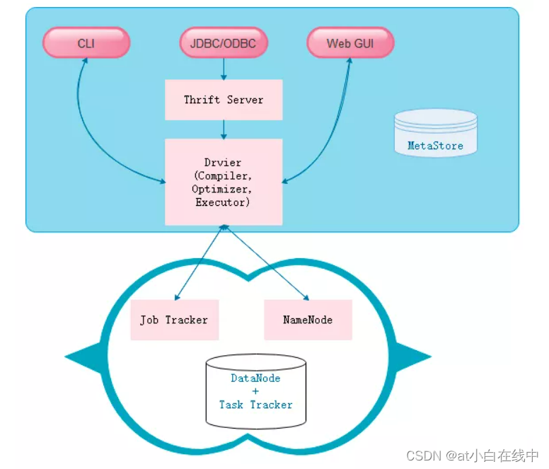 用户接口 CLI(Common Line Interface):Hive的命令行,用于接收HQL,并返回结果;JDBC/ODBC:是指Hive的java实现,与传统数据库JDBC类似;WebUI:是指可通过浏览器访问Hive。