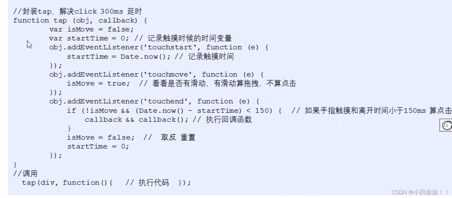 - 利用touch事件封装解决延迟:原理--手指触摸屏幕,记录当前时间,手指离开屏幕,用离开事件-触摸事件,如果事件<150ms,并且没有滑动屏幕,则为点击