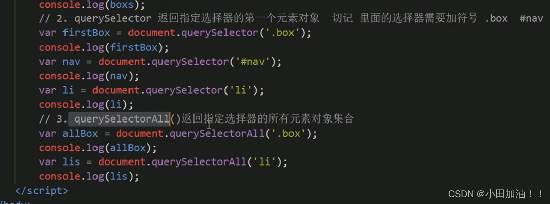 通过querySelector、querySelectorAll获取指定选择器的第一个元素对象或者所有对象(切记:里面的选择器需要加符号!!!eg:类->.box id->#nav)(H5新增)