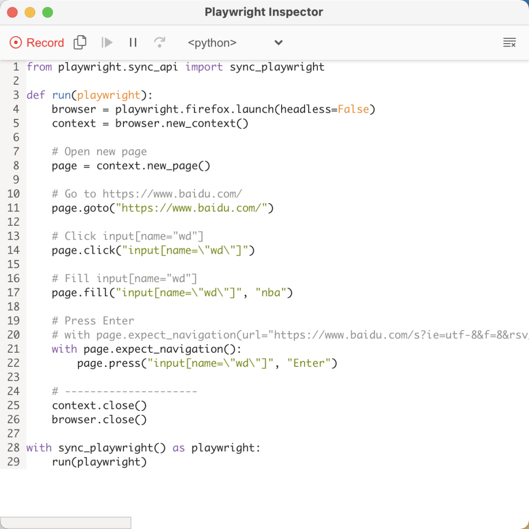 操作完毕之后,关闭浏览器,Playwright 会生成一个 script.py 文件,内容如下: