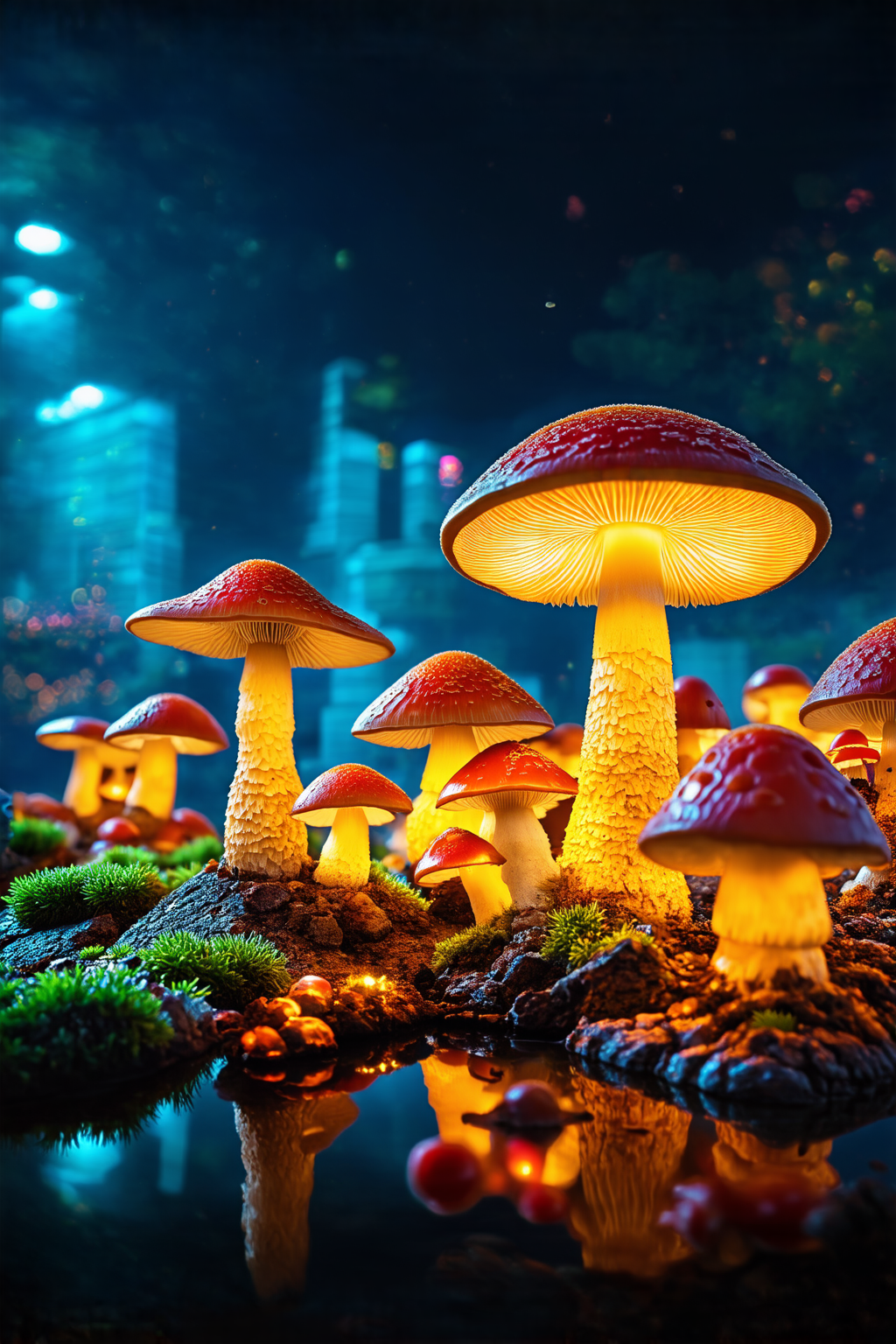 mushroom cityscape, mushroom architecture, intricately detailed, surreal mushroom cityscape, glowing luminescence, vibrant colors, complex background, photorealistic, cinematic composition, macro shot, light reflections, ethereal atmosphere, aerial view, Chiaroscuro Lighting Style, partially covered in shadow