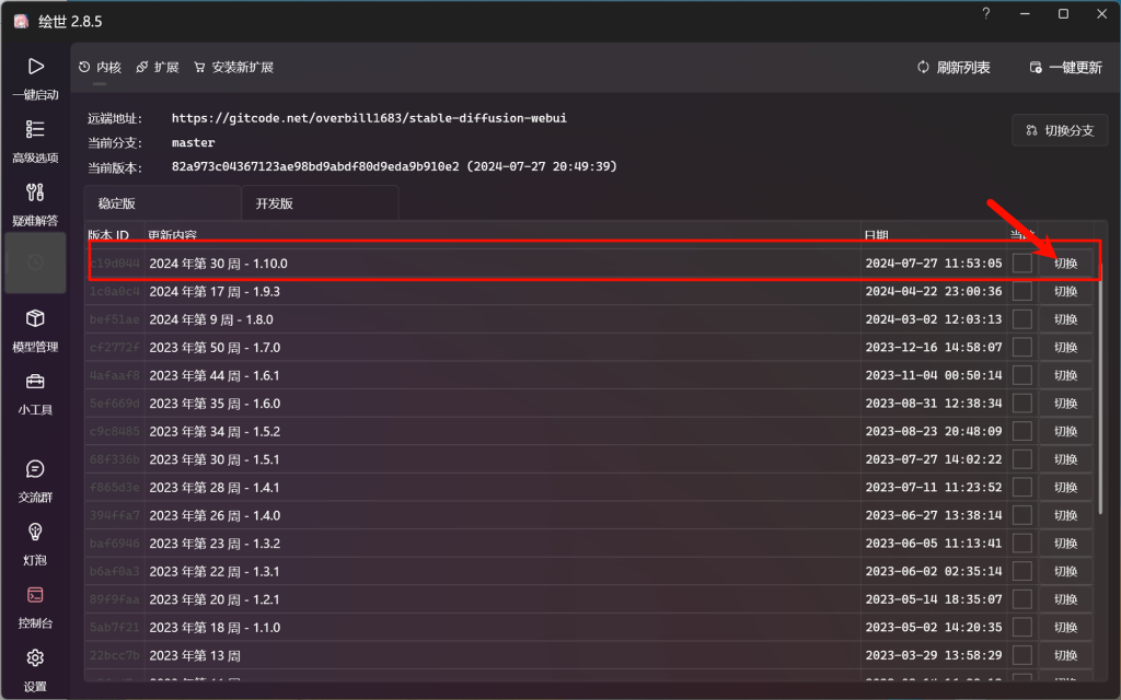 在下载模型的同时,我们打开秋叶大佬的绘世启动器,升级SDwebUI内核到v1.10.0。