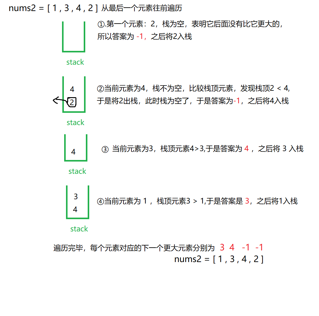 这个问题我们实际上只需要观察 nums2 即可,我们倒着从 nums2 的最后一个元素开始,找到 nums2 中的每个元素的下一个最大元素。
