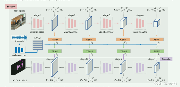 通过ASPP模块(Atrous Spatial Pyramid Pooling)增强视觉特征的感受野,生成多尺度特征Vi。 - 时序像素级音频-视觉交互(TPAVI模块):