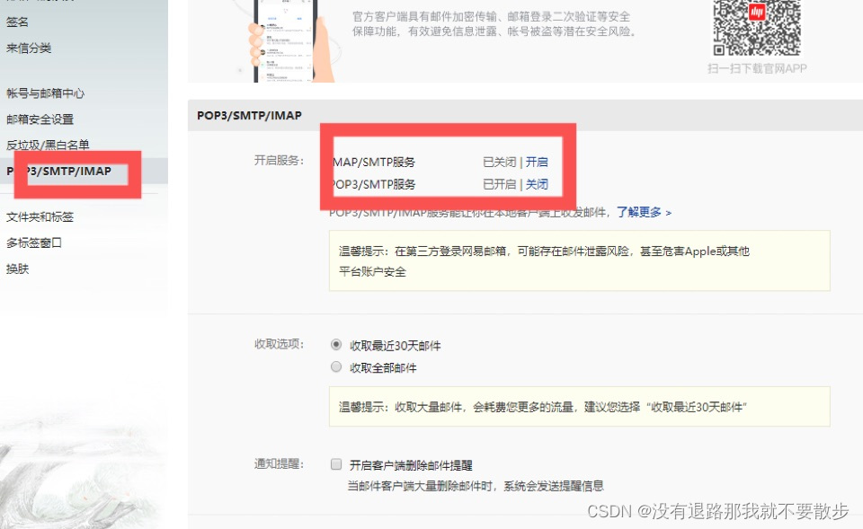 进入邮箱(以网易邮箱为例)找到上方设置根据自己喜好打开一到两个服务