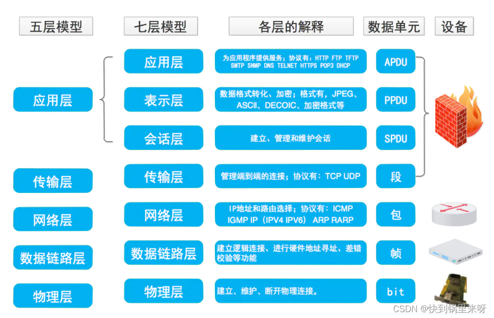 实际上OSI七层模型既复杂又不实用,所以OSI七层模型没有落地、实现。