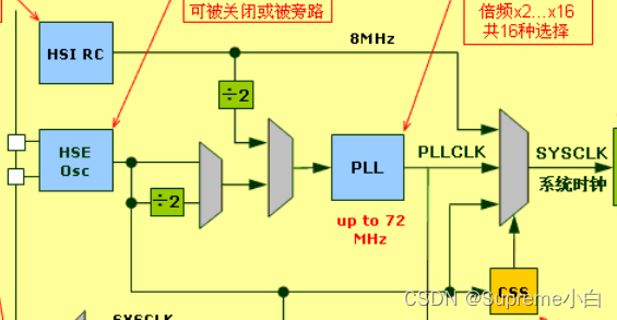 3.1 由时钟树可知,HSI和HSE以及PLL锁相环倍频器的PLLCLK经选择器用于系统时钟,如下图