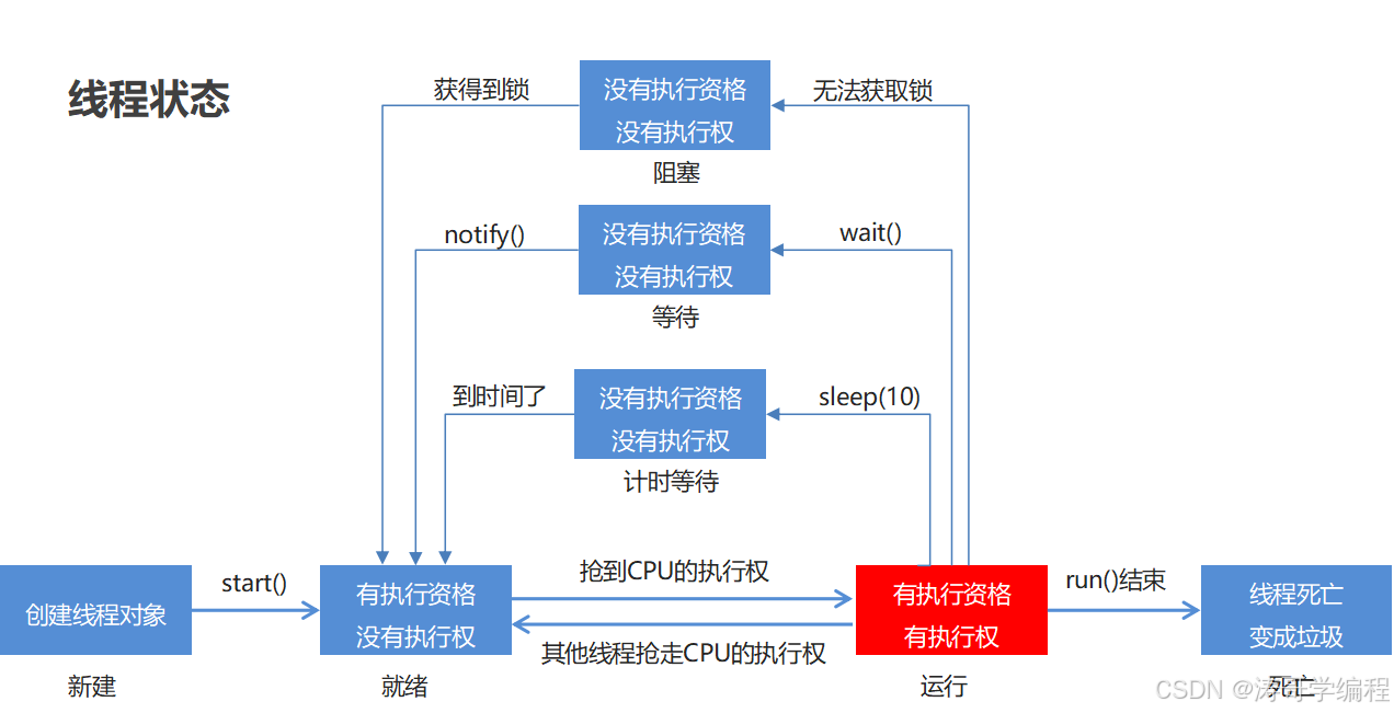 一文读懂java线程池 当线程被创建并启动以后,它既不是一启动就进入了执行状态,也不是一直处于执行状态。线程对象在不同的时期有不同的状态。那么Java中的线程存在哪几种状态呢?Java中的线程/* 新建 */NEW ,/* 可运行状态 */RUNNABLE ,/* 阻塞状态 */BLOCKED ,/* 无限等待状态 */WAITING ,/* 计时等待 *//* 终止 */TERMINATED;// 获取当前线程的状态通过源码我们可以看到Java中的线程存在6种状态,每种线程状态的含义如下。