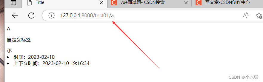 {% load filters %} {% load labels %} <!DOCTYPE html> <html lang="en"> <head> <meta charset="UTF-8"> <title>Title</title> </head> <body> <div> {{ feng|myupper }} <p>自定义标签</p> {% show_name '小' %} <li>时间:{% show_time "%Y-%m-%d" %}</li> <li>上下文时间:{% current_time %}</li> </div> </body> </html>include.py