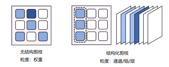 结构化剪枝是一种模型压缩技术,它通过剪除模型中较大的结构单元,如神经网络的整个层或通道,从而达到减少计算量的目的。与无结构剪枝(移除单个权重)相比,结构化剪枝的粒度更大,因此能够直接与硬件平台的优化机制匹配,提升推理速度。然而,结构化剪枝的缺点是,由于剪枝的粒度较粗,它可能会显著影响模型的整体性能。