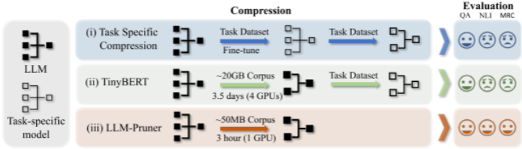 - LLM-Pruner:这个算法为大语言模型(如LLaMA)提出了任务无关的结构化剪枝方法。它首先识别模型中需要一起移除的成对结构,比如神经元之间的耦合、MLP层或多头注意力(MHA)层之间的依赖关系。通过建立依赖图,LLM-Pruner能够高效地找到这些耦合结构并评估它们对模型性能的贡献,然后剪除重要性较低的部分。在剪枝后,LLM-Pruner还通过LoRA(Low-Rank Adaptation)方法来微调模型,以恢复性能。